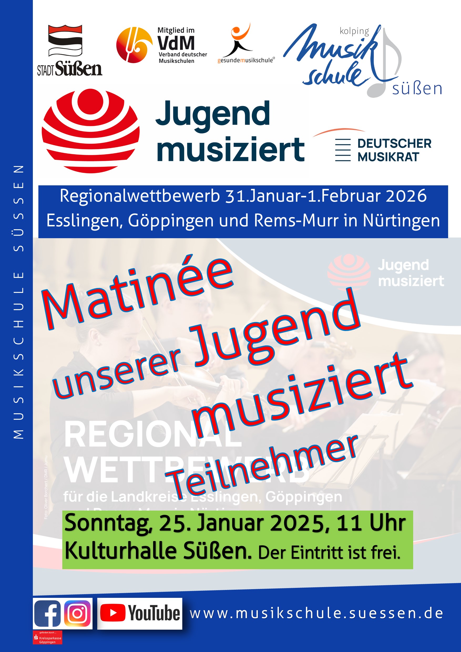 "Matinee unserer Teilnehmer Jugend musiziert 2026 - Regionalwettbewerb in Nürtingen".Der Regionalwettbewerb Jugend musiziert der Region Esslingen, Göppingen und Rems-Murr findet dieses Jahr vom 31.1 - 01.02.2026 in Nürtingen statt