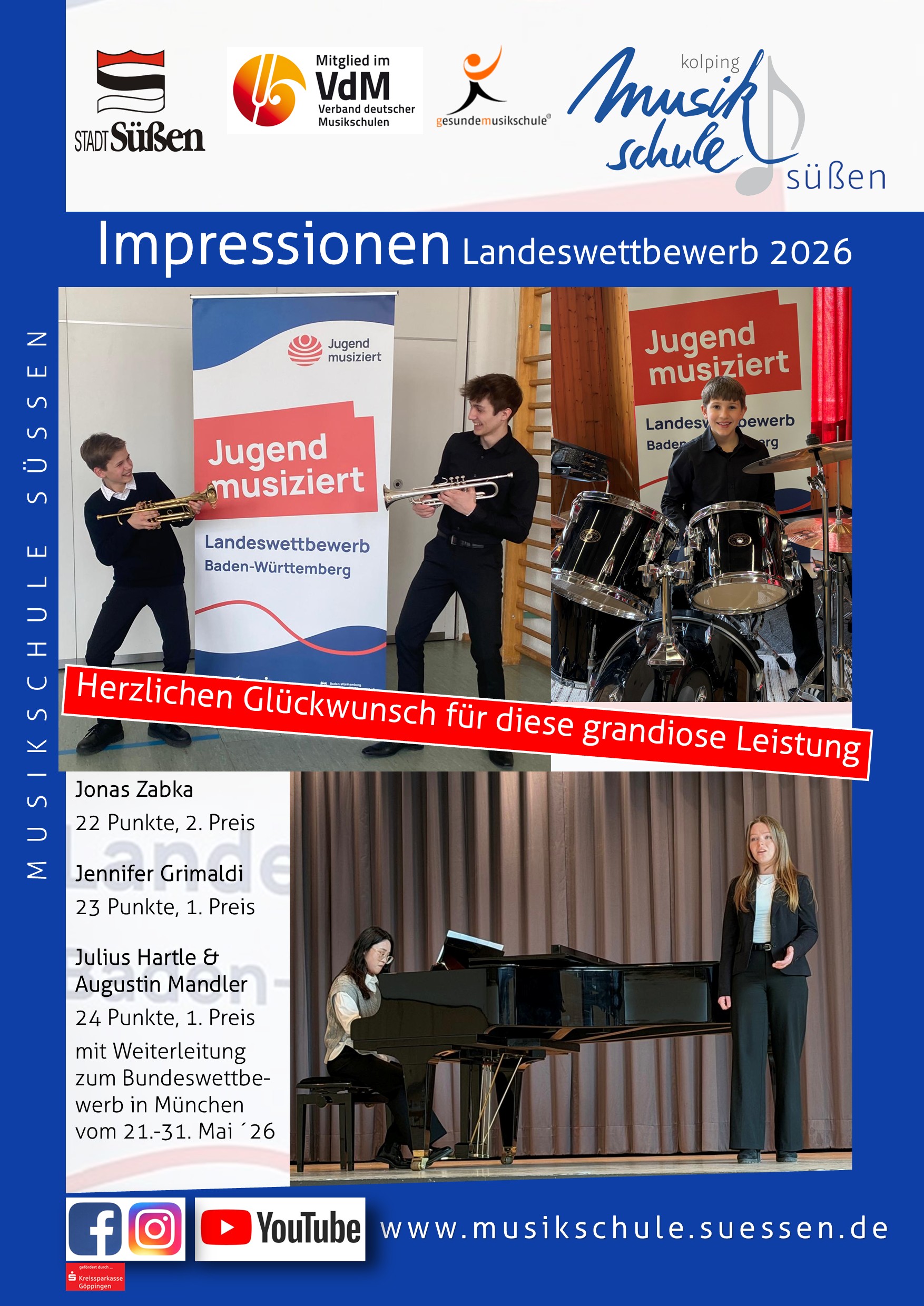 Jonas Zabka, Drum-Set POP, 22 Punkte, 2. Preis. Jennifer Grimaldi, 23 Punkte, 1. Preis. Julius Hartle & Augustin Mandler, 24 Punkte, 1. Preis mit Weiterleitung zum Bundeswettbewerb in München. Herzlichen Glückwunsch zu dieser grandiosen Leistung, wir sind sehr stolz auf euch!