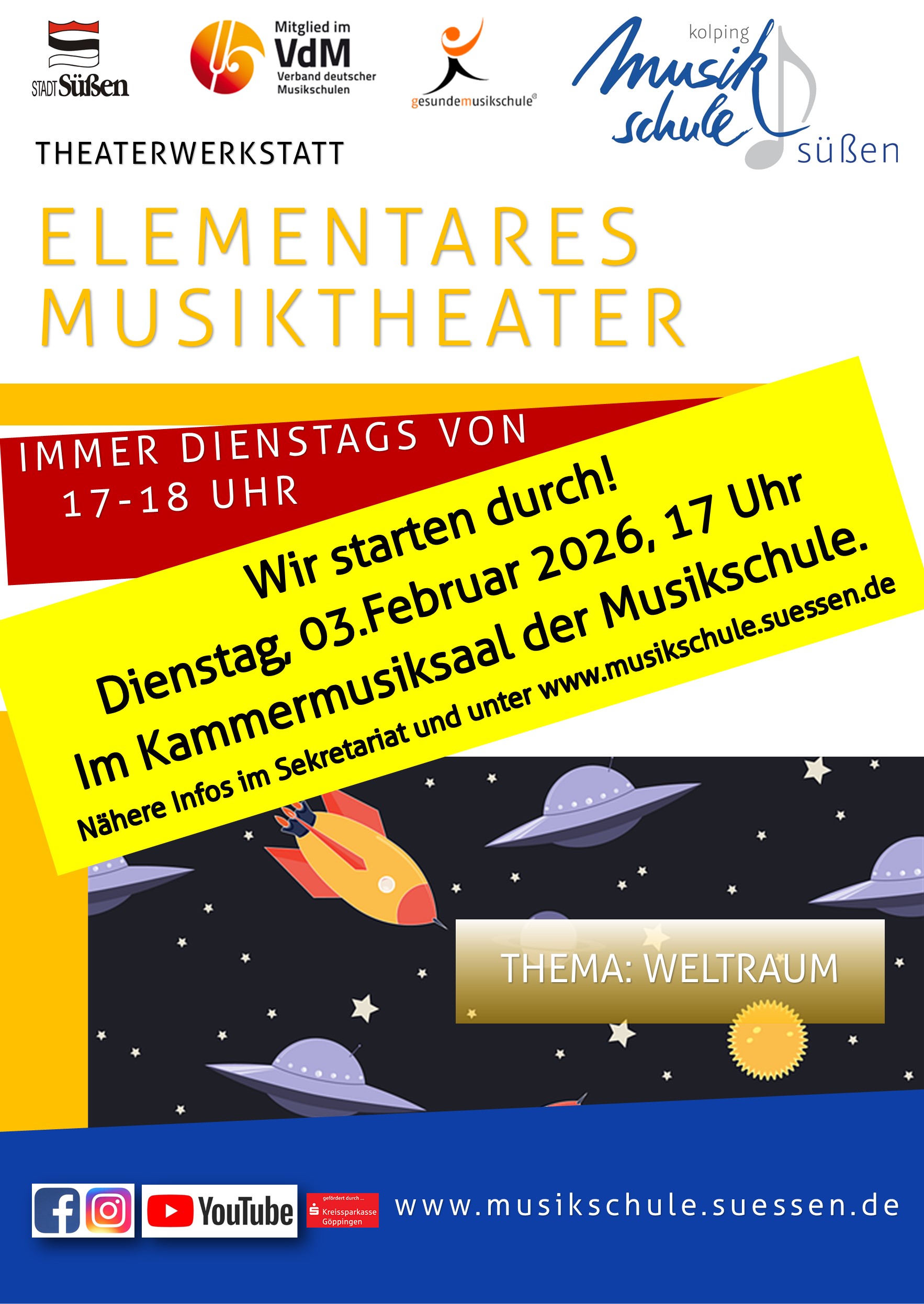 Unser elementares Musiktheater unter der Fachkundigen Anleitung unserer Lehrkraft Markus Heim beginnt am 03. Februar 2026 um 17 Uhr im Kammermusiksaal der Musikschule. Alle interessierten Kinder sind herzlich dazu eingeladen. Nähere Infos im Sekretariat.