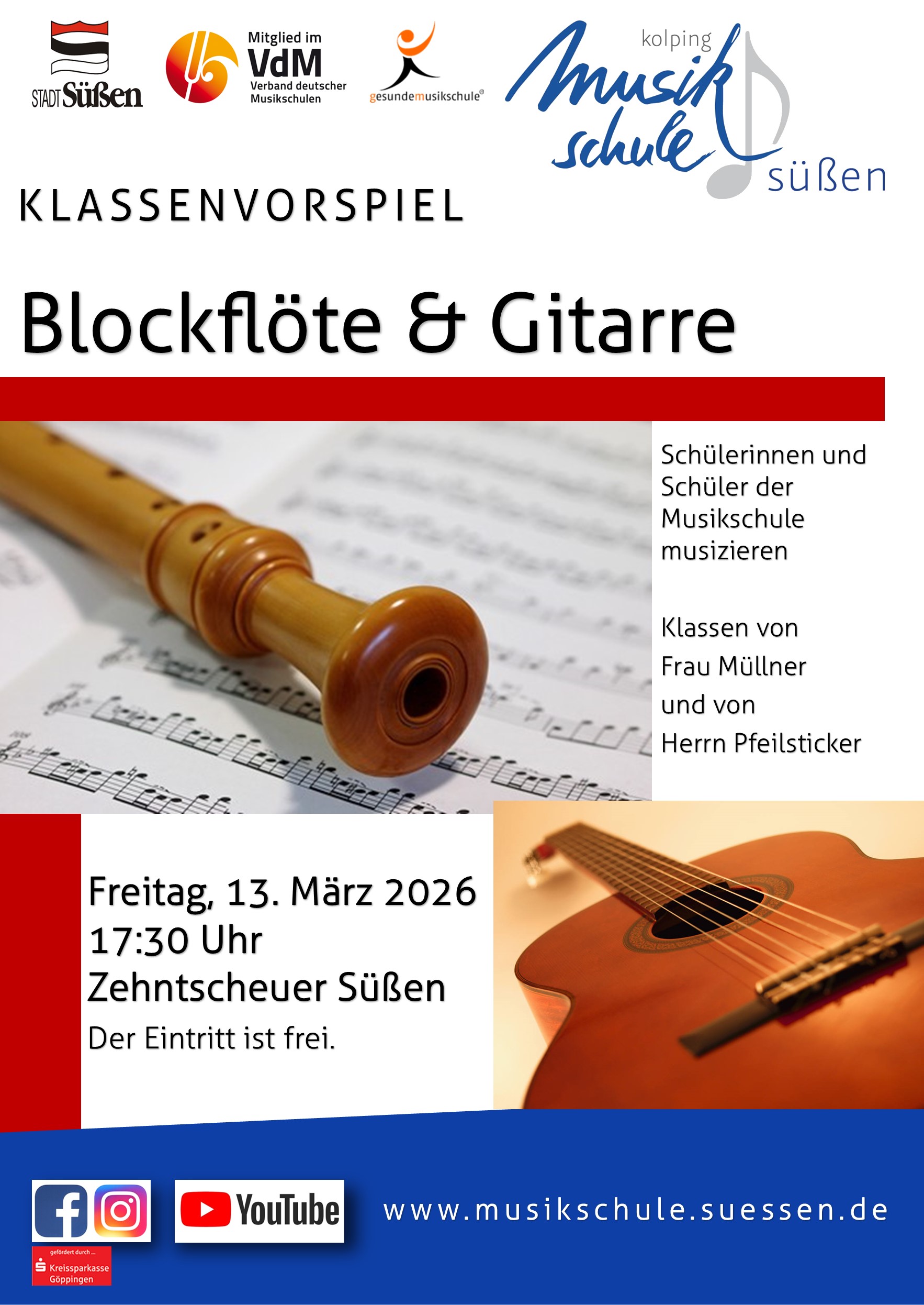 Wir laden Sie und euch herzlich zu unserem Klassenvorspiel der Blockflötenklasse von Ursula Müllner und der Gitarrenklasse von Ulrich Pfeilsticker ein! Das Vorspiel findet am Freitag, 13.März 2026 um 17:30 Uhr in der Zehntscheuer in Süßen statt.